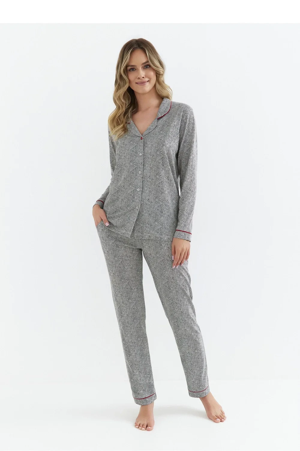 Elegantní dámské pyžamo v košilovém stylu je ideální kombinací elegance a pohodlí. Vyrobeno z měkké, prodyšné látky s potiskem, poskytuje pohodlí během celé noci. Košile s dlouhým rukávem má klasický límec a je zapínána na knoflíky, co dodává celku elegantní charakter. Elegantní detaily typu piping zdůrazňují pečlivé provedení. Volný střih zaručuje volnost pohybu a dlouhé kalhoty s praktickými kapsami zajišťují pohodlí při nošení. Celá kolekce je zabalena do fóliového sáčku, což z ní činí skvělý dárek.