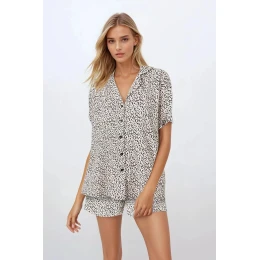 Elegantní dámské pyžamo s klasickým střihem, navržené s ohledem na pohodlí a styl. Dvoudílná sada se skládá z volné košile s krátkým rukávem, zapínání na knoflíky, s výstřihem do špičky a kraťasů s pohodlným elastickým pasem. Jemná, decentní barevnost a elegantní manžety dodávají celku ženský šarm. Pyžamo je ušito z přírodních, hypoalergenních materiálů, které jsou jemné k pokožce a příjemné na dotek, což z něj činí skvělou volbu jak na teplé noci, tak na lenivá rána. Produkt navržený a vyrobený v Polsku, balený v estetickém balení, skvělý nápad na dárek.