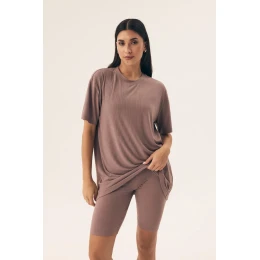 Pohodlná a stylová dámská pyžama, ideální jak k spaní, tak jako pohodlné oblečení do domu. Vyrobená z měkkého, prodyšného pleteného materiálu s pruhovanou strukturou, poskytuje plnou volnost pohybu a skvělé přizpůsobení tělu. Horní část pyžama má volný střih a polokruhový výstřih, díky čemuž skvěle padne na postavu a neomezí pohyb. Legíny sahající ke kolenu mají široký elastický pas, co zaručuje pohodlné a stabilní přizpůsobení. Tento set se skvěle hodí nejen jako pyžamo, ale také jako domácí oděv na lenivá rána nebo relaxační večery. Celý set je balen v praktickém fóliovém sáčku.