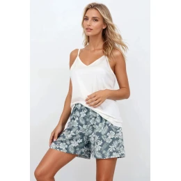 Tato jedinečná dámská pyžama je ideální kombinací ženského stylu a pohodlí. Sestava se skládá z lehké topu na ramínka s V výstřihem a vzorovaných kraťasů s pohodlným elastickým páskem v pasu. Volný, oversized střih poskytuje plnou volnost pohybu a elegantní dokončení decentně zdůrazňuje postavu. Vyrobeno z prodyšné, jemné pleteniny, která příjemně obepíná tělo a skvěle poslouží po celý rok. Vysoká kvalita potisku na kraťasech a pečlivé provedení zaručují trvanlivost a pohodlí nošení. Navrženo a ušito v Polsku s důrazem na každý detail, skvěle poslouží jak jako pyžamo, tak jako stylový dárek pro blízkou osobu. Složení: Horní část: 92% viskóza, 8% elastan Dolní část: 100% viskóza