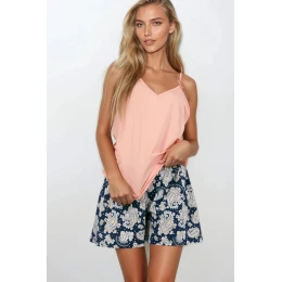 Elegantní a pohodlná dvoudílná dámská pyžama je ideální kombinací elegance, ženského půvabu a pohodlí. Vyrobena z jemné, elastické a hypoalergenní viskózy přírodního původu, zaručuje pohodlí při nošení jak v noci, tak během dne, skvěle se hodí také jako domácí oděv. Top s ramínky a výstřihem ve tvaru špičky krásně zdůrazňuje ramena a zeštíhluje krk, zatímco jemná aplikace v oblasti prsou dodává celku šarm a výjimečný charakter. Volný, ale zároveň elegantní střih poskytuje plnou volnost pohybu a pohodlí nošení. Krátké kalhoty s gumou v pase se skvěle přizpůsobí postavě, neomezují a nepřekážejí v pohybu. Celkový vzhled je udržován v elegantním stylu, s vysokou kvalitou potisku materiálu a pečlivým provedením. Navrženo a ušito v Polsku, toto pyžamo je skvělým návrhem pro ženy, které oceňují pohodlí, kvalitu a decentní styl jak pro spaní, tak i pro lenivá domácí rána. Složení: Horní část: 92% viskóza, 8% elastan Dolní část: 100% bavlna