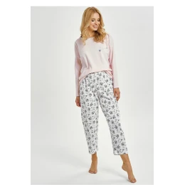 Dvoudílný dámský pyžamový set, který spojuje pohodlí a stylový vzhled. Košile s dlouhým rukávem zdobená stylovým nápisem, vyrobená z měkkého materiálu příjemného na dotek. K setu patří pohodlné kalhoty délky 7/8 s efektním potiskem, který dodává celku lehkost a dívčí kouzlo. Elastický pásek zajišťuje perfektní přiléhání a pohodlí při spaní. Pyžamo je baleno v praktickém fóliovém sáčku, ideální i jako dárek.