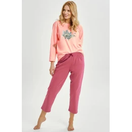 Pohodlná dámská pyžama navržená s ohledem na každodenní relaxaci. Tričko s 7/8 rukávem a polokroužkovým výstřihem vyrobené z měkkého materiálu, zdobené módním potiskem. Volný střih poskytuje plnou volnost pohybu a pohodlí při nošení. K tomu patří kalhoty 7/8, bez kapes, s širokým elastickým pasem a ozdobnou mašlí, která dodává celku šarm. Lehký a příjemný materiál v doteku zaručuje, že pyžamo bude skvěle sloužit jak pro večerní relaxaci, tak pro klidný spánek. Zabalené v foliovém sáčku, ideální také jako dárek.