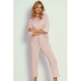 Pyžamo ženského volného a pohodlného střihu, ideální pro relaxaci a klidný spánek. Tričko s 3/4 rukávem a klasickým kulatým výstřihem poskytuje volnost pohybu, zatímco kalhoty 7/8 bez kapes jsou v neutrální barevné paletě, která zdůrazňuje minimalistický styl. Šňůrky v pasu a gumový lem zajistí pohodlné přizpůsobení. Celý kus je zabaleno do praktického plastového pytlíku, skvělé jako dárek nebo na každodenní nošení.
