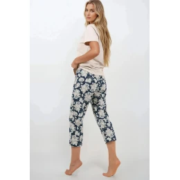Elegantní dámský pyžamo s volným a pohodlným střihem, vyrobené z přírodních materiálů, které zajišťují měkkost a prodyšnost. Dvoudílná souprava se skládá z trička s polokruhovým výstřihem a krátkým rukávem a kalhot o délce 7/8 s přímou nohavicí a gumou v pasu pro ideální přizpůsobení. Pyžamo nemá kapsy, což zdůrazňuje jeho minimalistický, elegantní střih. Polský produkt navržený a ušitý s důrazem na vysokou kvalitu tisku materiálu a detailů, zaručující pohodlí a styl během odpočinku. Složení: Horní část: 96% bavlna, 4% elastan Dolní část: 100% bavlna