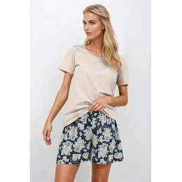 Dámský pyžamový set s certifikátem OEKO-TEX Standard 100, vyrobený z přírodních, hypoalergenních materiálů, které poskytují pohodlí a bezpečí citlivé pokožce. Dvoudílný set se skládá z volného vrchního dílu s polokruhovým výstřihem a krátkým rukávem a elegantních kalhot s módním potiskem a elastickým pasem pro ideální přizpůsobení. Ženský styl a elegantní design dělají pyžamu dokonalým spojením pohodlí a estetiky. Polský produkt, navržený a ušitý s důrazem na vysokou kvalitu tisku a detailů.