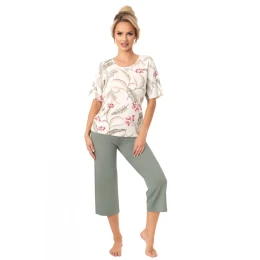 Elegantní a pohodlný dámský pyžamový set vyrobený z jemné, měkké viskózy, která poskytuje pohodlí a prodyšnost během spánku. Tričko s krátkým rukávem a kulatým výstřihem je zdobeno decentním potiskem, který dodává ženský charakter. Kalhoty typu 3/4 v klasickém střihu regular fit, bez kapes, jsou zakončeny elastickým pásem v pasu, co zaručuje ideální přizpůsobení a volnost pohybu. Jedná se o skvělou volbu pro ženy, které ocení pohodlí a elegantní, lehký styl.