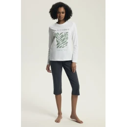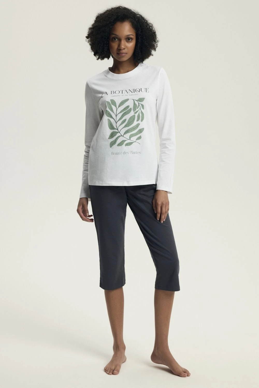 Dámský pyžamový set ve stylovém a zároveň pohodlném střihu, vytvořený s ohledem na pohodlí během spánku a domácího relaxu. Tričko s dlouhým rukávem a kulatým výstřihem je zdobeno jemným potiskem, který celku dodává jemný šarm. Kalhoty typu 3/4 ve střihu slim se krásně přizpůsobují postavě, poskytují volnost pohybu. Model bez kapes, s širokým pásem s elastickou gumičkou, zaručuje pohodlné a stabilní přizpůsobení. Celý set je zabalen v praktickém fóliovém sáčku, ideální volba pro ženy, které ocení pohodlí, kvalitu a ženský styl.
