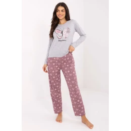Dámský pyžamový set je okouzlující dvoudílný komplet, který spojuje pohodlí s jemným ženským stylem. Tričko s dlouhým rukávem a kulatým výstřihem je zdobeno na přední straně efektním motýlem se nápisem, vytvářejícím jemný a dekorativní akcent. Dlouhé kalhoty mají v pase vsazený elastický pásek, díky čemuž skvěle sedí a poskytují plnou volnost pohybu. Materiál kalhot zdobí potisk s motýly a květinami, který pyžamu dodává lehkost a romantický charakter. Jednoduché, dlouhé nohavice zaručují pohodlí a komfort během spánku a domácího relaxu. Je to skvělá volba pro ženy, které ocení měkké materiály, pohodlný střih a jemné, ženské vzory.