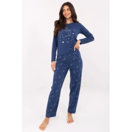 Dámský pyžamový set skládající se z trička a dlouhých kalhot, vyrobený z měkkých a pohodlných materiálů ideálních pro noční odpočinek. Tričko je zdobené hvězdičkovým potiskem, který dodává celku lehký a příjemný charakter. Má kulatý výstřih a dlouhý rukáv, poskytující pohodlí a teplo. Dlouhé kalhoty mají rovný střih nohavic, zaručující volnost pohybu a klasický vzhled. Jedná se o stylový a pohodlný pyžamový set navržený pro klidný a pohodlný spánek.
