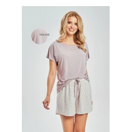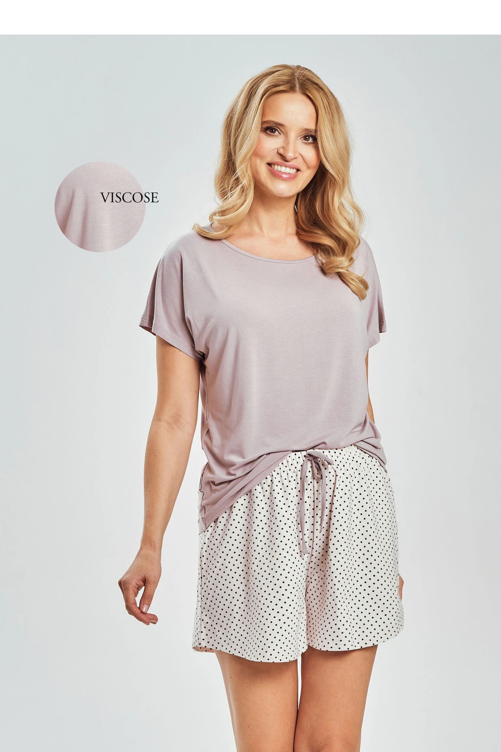 Dámský pyžamový set skládající se z volného trička a krátkých kalhotek, navržený s ohledem na maximální pohodlí a volnost. Tričko je vyrobeno z hladké, měkké viskózy v moderním kávovém odstínu, má krátký rukáv a klasický polo-obloukový výstřih, který zajišťuje pohodlné nošení. Soupravu doplňují krátké bavlněné kalhotky v barvě krému, zdobené jemným vzorem černých puntíků. V pasu je použitý dekorativní tkanička, která umožňuje individuální přizpůsobení a dodává celku jemný půvab. Pyžamo se skvěle hodí jak k odpočinku, tak k domácímu relaxu. Produkt je balen v praktickém fóliovém sáčku. Složení: Horní část: 92% modal, 8% elastan Dolní část: 94% bavlna, 6% elastan