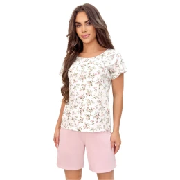 Bavlněná dámská pyžama vyrobená z měkké a prodyšné látky, zaručující pohodlný spánek a pohodlí během domácího odpočinku. Souprava se skládá z košile s krátkým rukávem zdobenou jemným květinovým vzorem a hladkých kalhot ve stínu pudrové růže. Nohavice kalhot jsou lehce prodloužené, co znamená, že pyžamo je ideální pro vysoké osoby nebo pro ty, kteří chtějí decentně zakrýt případné nedokonalosti. Kalhoty mají klasický střih bez kapes, co zdůrazňuje elegantní a minimalistický charakter celé soupravy.