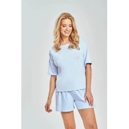 Pohodlný a lehký dámský pyžamový set, ideální na teplé noci a domácí relaxaci. Tričko s kulatým výstřihem a krátkým rukávem poskytuje volnost pohybu a klasický, univerzální vzhled. Volný, pohodlný střih zaručuje maximální pohodlí během spánku. Součástí jsou krátké kalhoty s módním potiskem, které dodávají celku charakter. Model má elastický pásek, který usnadňuje přizpůsobení postavě. Kalhoty nemají kapsy, co zdůrazňuje jejich lehký a minimalistický střih. Pyžamo je vyrobeno z měkkého a prodyšného materiálu a je baleno v praktickém fóliovém sáčku.