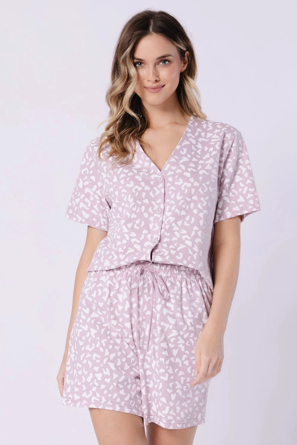 Elegantní a pohodlná dámská pyžama, ideální na teplé noci a domácí relax. Tričko s krátkým rukávem, zapínání na knoflíky, poskytuje lehkost a klasický elegantní vzhled. Volný a pohodlný střih zaručuje plnou volnost pohybu. Součástí jsou krátké kalhoty s potiskem, vyrobené z měkké a prodyšné látky, s elastickým páskem v pasu a praktickými šňůrkami, které umožňují ideální přizpůsobení. Celý set je balen v fóliovém sáčku, což usnadňuje skladování nebo přepravu.