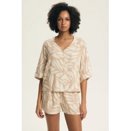 Elegantní a pohodlná dámská pyžama je ideální volbou pro ženy, které ocení pohodlí a módní vzhled. Horní část s V výstřihem, 3/4 rukávy a knoflíkovým zapínáním dodává celku lehce elegantní charakter a zajišťuje pohodlí při nošení. Oversize střih zaručuje volnost pohybu a volné, pohodlné padnutí. Soupravu doplňují krátké kalhoty, které se skvěle hodí na teplé noci. Materiál s potiskem dodává pyžamu výjimečný styl a celkově vypadá žensky a moderně. Pyžáma je balena v praktickém fóliovém sáčku, takže se skvěle hodí i jako dárek.