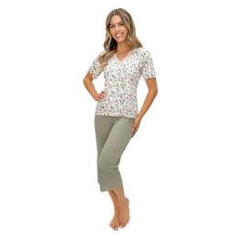 Elegantní dámské pyžamo spojující pohodlí s decentními ženskými detaily. Vyrobeno z prodyšného pleteného materiálu, poskytuje pocit lehkosti a volnosti po celou noc, ideální na teplejší večery. Tričko s krátkým rukávem má výstřih typu V, zakončený jemnou krajkou, která decentně zdůrazňuje linii krku a dodává elegantní charakter. Moderní potisk dodává celku svěží a moderní vzhled. Kalhoty typu 3/4 mají v pasu gumu, zajistí pohodlné přizpůsobení a plnou volnost pohybů. Pyžamo je baleno v praktickém fóliovém sáčku, pohodlná, stylová a praktická volba jak na každodenní nošení, tak jako dárek.