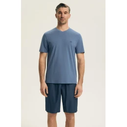 Pohodlný pánský pyžamový set navržený s ohledem na plnou volnost a pohodlí během spánku. Volný, pohodlný střih zajišťuje neomezený pohyb, zatímco krátký rukáv a krátké kalhoty dělají pyžamo lehkým a prodyšným, ideálním na teplé noci. Tričko s výstřihem do špičky jemně zdůrazňuje mužský styl a kalhoty bez kapes udržují jednoduchý a funkční charakter kompletního setu. Vsazené šňůrky v pase zaručují pohodlné přizpůsobení postavě, poskytují pohodlí po celou noc. Jedná se o praktický a stylový návrh pro muže, kteří oceňují spojení jednoduchosti, pohodlí a funkčnosti.