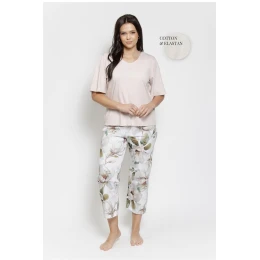 Dámský pyžamový set s rukávem po loket je pohodlný a stylový, ideální na spaní a relaxaci doma. Vrchní díl s výstřihem typu U zajišťuje pohodlí a volnost pohybu, zatímco rukáv po loket přidává lehkost a příjemnou prodyšnost. Kalhoty s délkou 7/8 s atraktivním potiskem doplňují celek, a elastický pásek v pasu zaručuje pohodlné přizpůsobení se postavě. Pyžamo je baleno ve fóliovém sáčku, co chrání produkt a usnadňuje jeho skladování.
