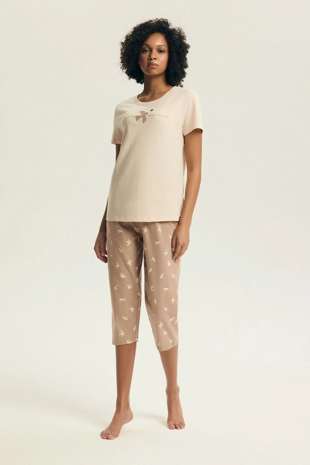 Pyžamo pro ženy, které spojuje pohodlí s módním a ženským stylem. Souprava se skládá z trička s krátkým rukávem a efektním potiskem, který dává celku výjimečný charakter. Měkká látka a pečlivé provedení zajistí pohodlí nošení a potěšení pro pokožku. Součástí jsou kalhoty typu 3/4 s přizpůsobeným potiskem, které vytvářejí souvislý a stylový outfit. Model má široký elastický pás, díky kterému se dobře přizpůsobuje postavě a zajišťuje pohodlí při spaní a denním odpočinku. Kalhoty nemají kapsy, co zdůrazňuje jejich lehký a volný charakter. Pyžamo je vyrobeno z vysoce kvalitních materiálů, což zaručuje trvanlivost a pohodlí při nošení. Celý set je balen v praktickém fóliovém sáčku.