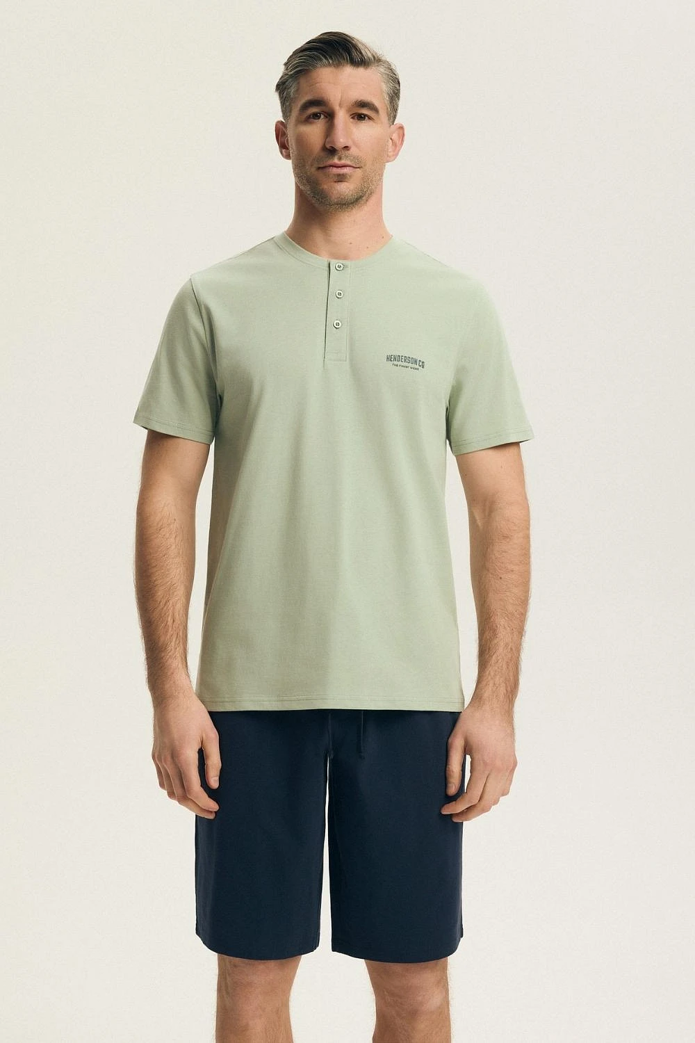 Mužský pyžamový set je pohodlný a funkční, který se skvěle hodí jak na spaní, tak i jako pohodlné oblečení doma. Klasický střih a univerzální styl zaručují pohodlí a volnost pohybu každý den. Tričko s krátkým rukávem je vybaveno kulatým výstřihem a zapínáním na tři knoflíky, což mu dodává praktický charakter a usnadňuje oblékání. Součástí setu jsou krátké kalhoty po kolena, které zaručují pohodlí a prodyšnost, zejména v teplejších dnech. Kalhoty mají elastický pásek a šňůrku na stahování, díky čemuž je lze perfektně přizpůsobit postavě. Celý set je vyroben z materiálů příjemných na dotek, které zaručují pohodlí a volnost pohybu jak při spaní, tak i odpočinku doma.