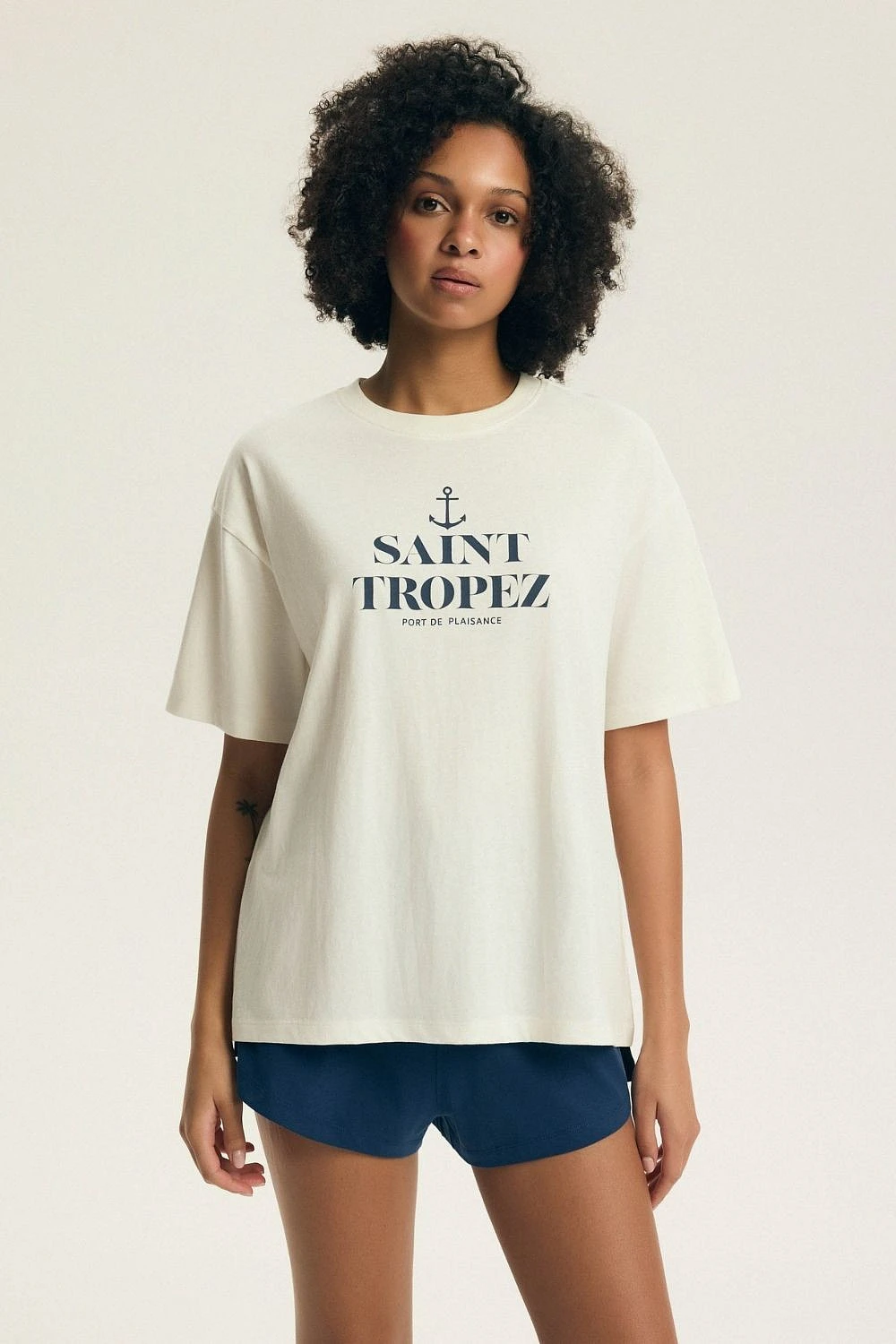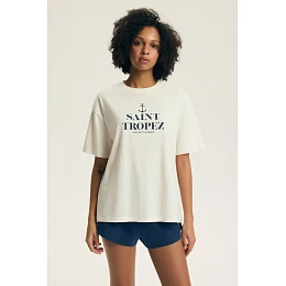 Dámský pyžamový set je pohodlný a stylový kousek, který se skvěle hodí jak na spaní, tak i jako pohodlné oblečení doma. Volný střih poskytuje plnou volnost pohybu a jemný design dodává celku lehkost a ženský charakter. Tričko s krátkým rukávem má kulatý výstřih vpředu i vzadu, co dodává subtilní eleganci a moderní vzhled. Na přední straně trička je módní nápis, který zdůrazňuje volný charakter setu. Krátké kalhoty jsou vyrobeny v pohodlném střihu s širokým elastickým pásem a šňůrkami v pasu, co umožňuje ideální přizpůsobení postavě. Celý kousek je vyroben z měkké, příjemné látky, zaručující pohodlí po celý den a noc.