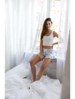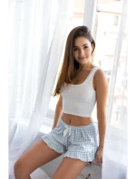 Bílomodrý pyžamový komplet s krátkým vrškem a šortkami, ideální na prázdninové období. Bílý hladký vršek s širšími ramínky se hodí i k prakticky jakémukoli jinému pyžamu nebo džínům. Kostkované šortky s volánkem kolem stehen a mašlí v pase vypadají neuvěřitelně půvabně. Složení: vršek 95 % bavlna, 5 % elastan, šortky 100 % bavlna.
