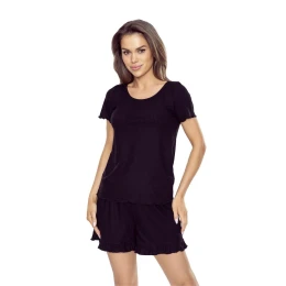Pohodlné a stylové letní dámské pyžamo z vysoce kvalitní žebrované viskózy, která zaručuje pohodlí a prodyšnost za teplých nocí. Souprava se skládá z trička s krátkým rukávem a kulatým výstřihem a krátkých šortek s pružným pasem. Malý volánek na konci nohavic dodává ženský nádech. Ideální na večerní procházku i na líná rána doma.