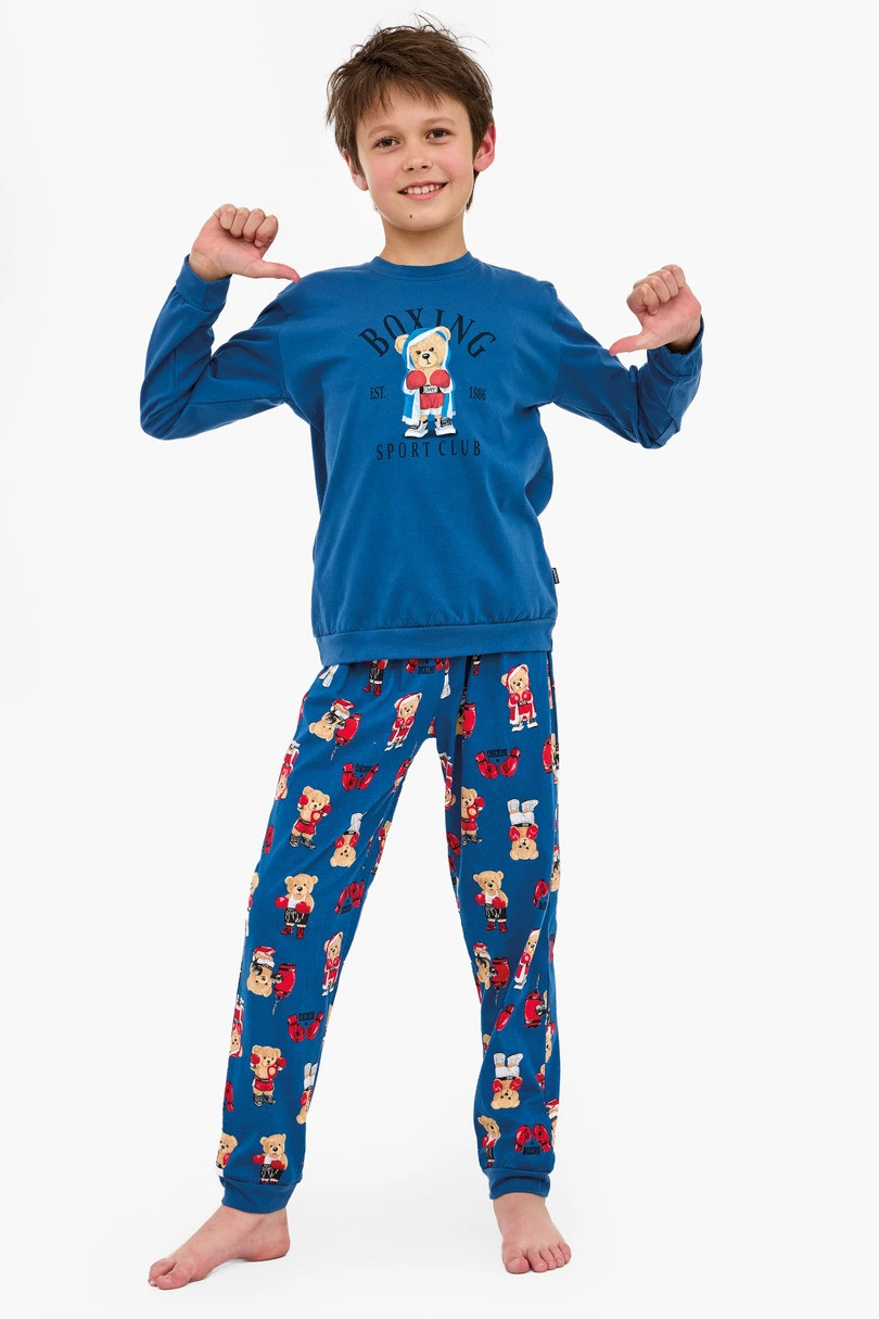 Chlapecké pyžamo BOY YOUNG DR 966/178 BOXER představuje pohodlí a styl v jednom. Je vyrobeno ze 100% kvalitní, měkké bavlny a poskytuje pohodlí a prodyšnost po celou noc. Blůzu s dlouhými rukávy zdobí na přední straně barevný potisk, který jí dodává chlapecký charakter. Manžety, spodní část blůzy a nohavice kalhot jsou lemovány pružnými manžetami, které zajišťují dokonalé přizpůsobení a zabraňují vyhrnování látky během spánku. Soupravu doplňují dlouhé vzorované kalhoty v kontrastní barvě. Celá souprava je zabalena v estetické krabičce - skvělý nápad na dárek.