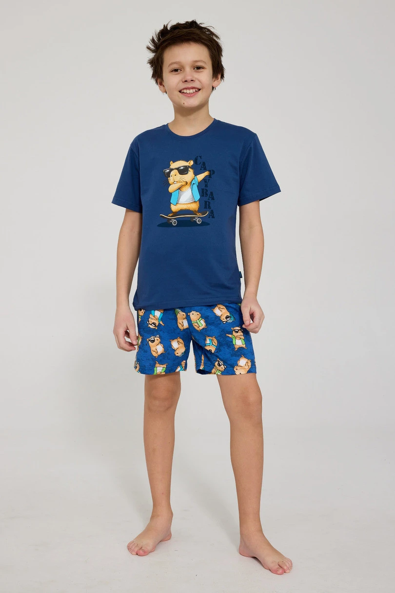 Chlapecké pyžamo CAPYBARA 2 je ideální pro teplé dny a letní noci. Je vyrobeno ze 100% kvalitní, měkké a prodyšné bavlny, která zajišťuje maximální pohodlí a dobrou cirkulaci vzduchu. Tričko s krátkým rukávem zdobí hravý potisk Capybary, který se jistě bude líbit mladším nositelům a dodá pyžamu hravý nádech.
