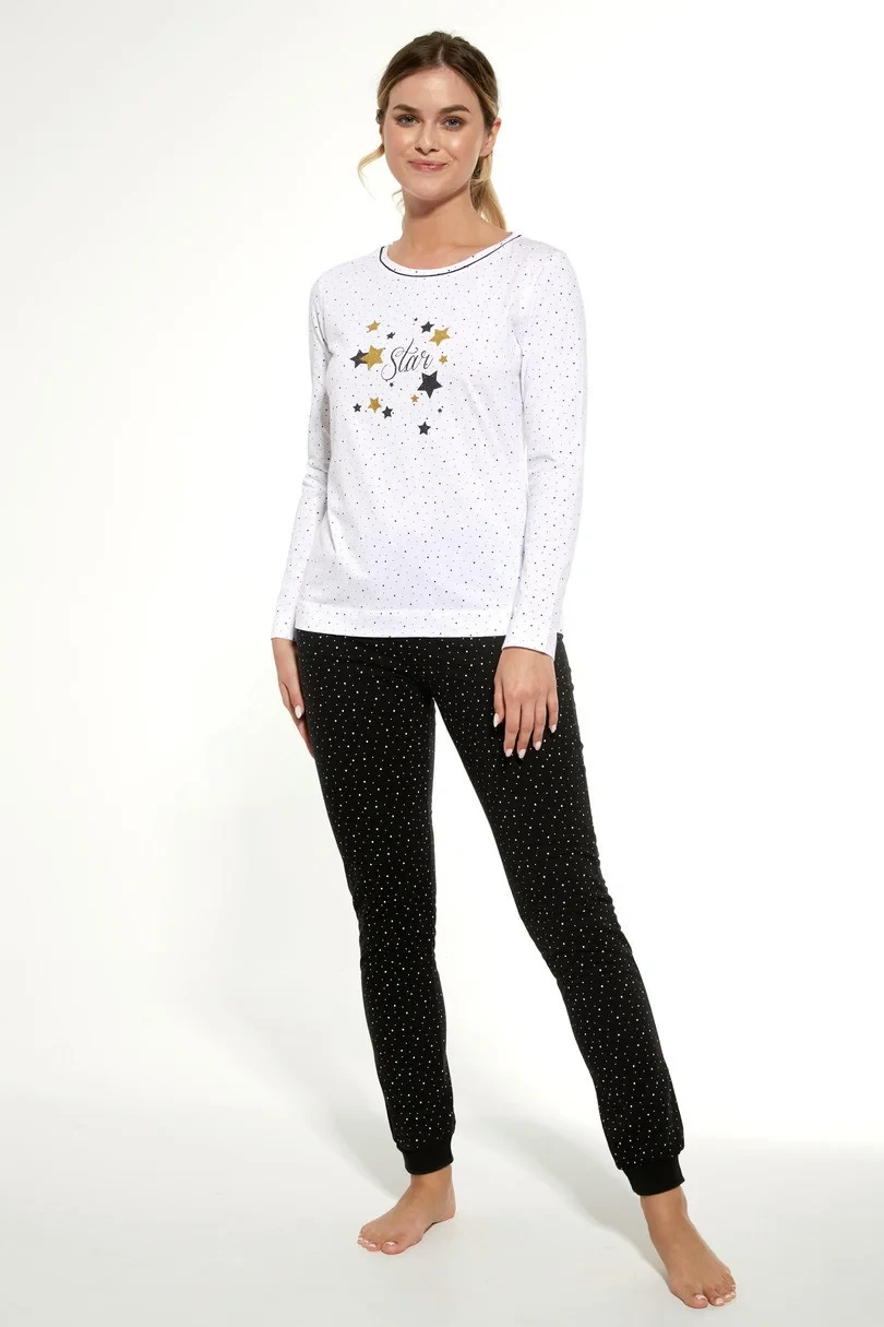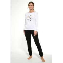 Dámské pyžamo z vysoce kvalitní měkké bavlny, tričko s dlouhým rukávem a barevným potiskem na přední straně, dlouhé vzorované kalhoty, balené v krabici.
