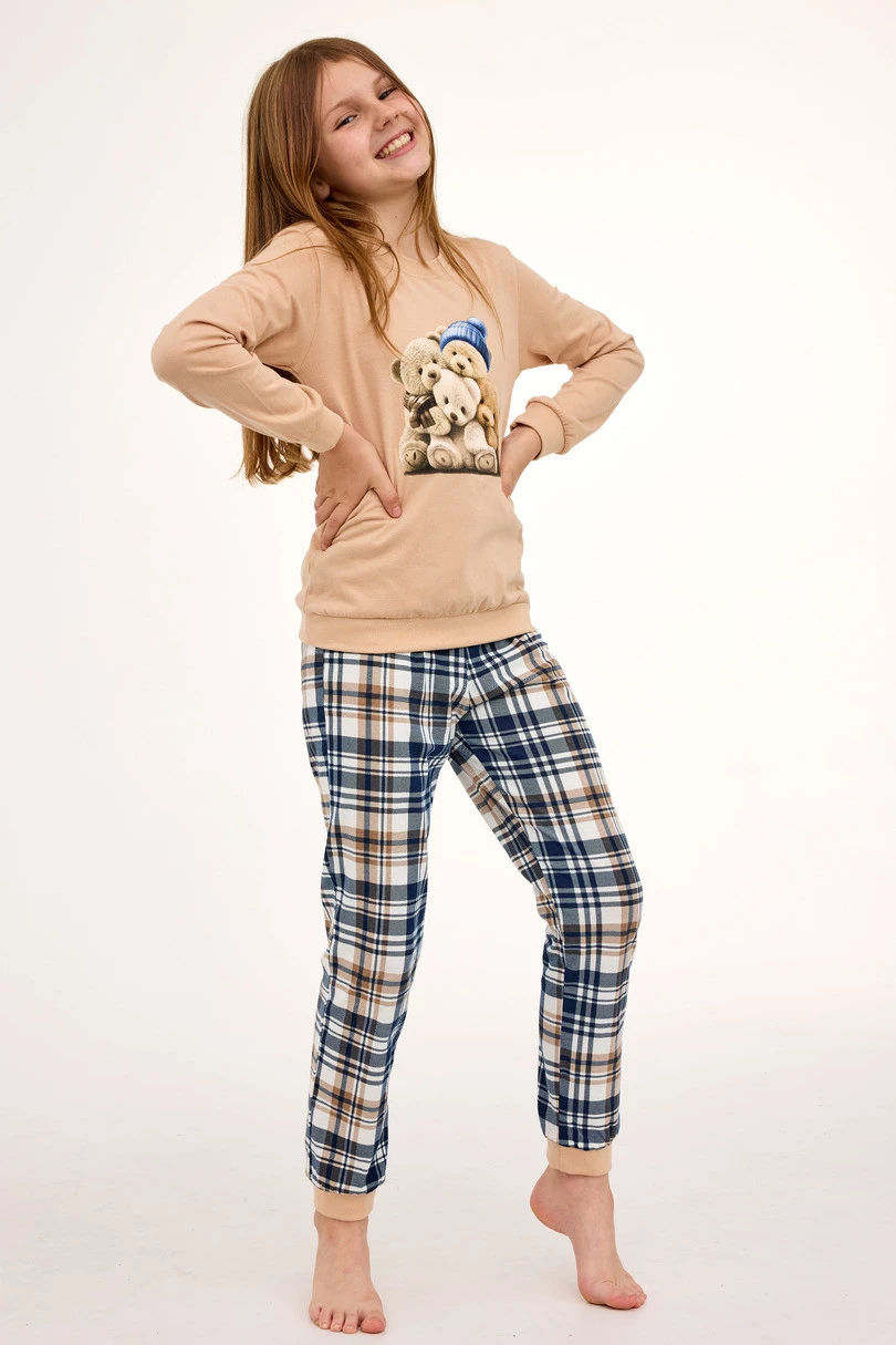 Dívčí pyžamo DR 592/187 BEARS je kombinací pohodlí a okouzlujícího designu. Je vyrobeno z měkké, vysoce kvalitní bavlny a zajišťuje pohodlí a volnost pohybu při spánku i domácích hrách. Tričko s dlouhými rukávy klasického střihu zdobí na přední straně barevný potisk, který mu dodává hravý charakter. Soupravu doplňují dlouhé kalhoty v módním kostkovaném vzoru. Rukávy, nohavice a spodní část trička jsou zakončeny praktickými šňůrkami, které zabraňují vyhrnování látky. Pyžamo je zabaleno v elegantní krabičce, což z něj činí také skvělý nápad na dárek.