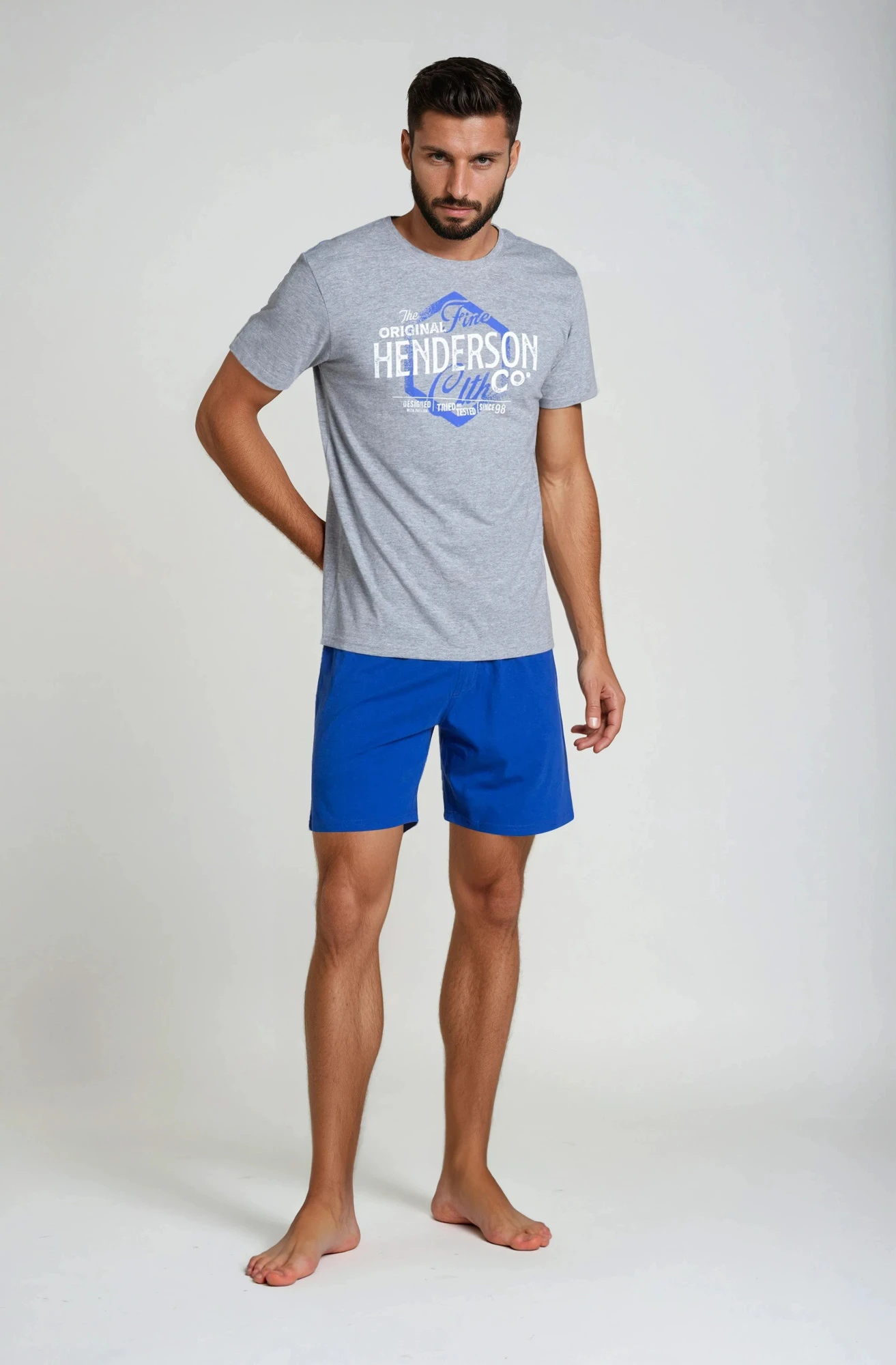 Lars - dvoudílné pyžamo v duu šedá + modrá, s šortkami pod kolena, z nadčasové řady Core značky Henderson. Najdete zde měkké, na dotek příjemné materiály, pohodlné střihy a potisky, které dodávají vzorům charakter. Složení: vrchní díl 90 % bavlna, 10 % viskóza, spodní díl 100 % bavlna.