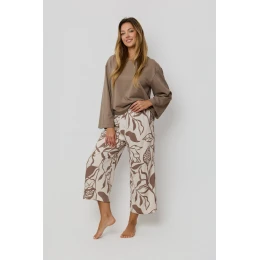 Stylowa i niezwykle komfortowa piżama damska, stworzona z myślą o wygodzie i estetyce codziennego wypoczynku. Górę stanowi jednolita koszulka z wysokiej jakości dzianiny bawełnianej z dodatkiem elastanu, która jest miękka, elastyczna i przyjemna dla skóry. Klasyczny, okrągły dekolt oraz długie rękawy zapewniają komfort termiczny i swobodę ruchów. Luźne spodnie o długości 7/8 wykonane z lekkiej, oddychającej wiskozy wyróżniają się modnym, roślinnym printem. Elastyczna gumka w pasie, umieszczona w tunelu, gwarantuje idealne dopasowanie bez ucisku. To doskonały wybór zarówno na noc, jak i na domowy relaks w stylowym wydaniu.