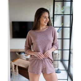 Pokud máte rádi měkké úplety připomínající svetry, tento set si zamilujete. Jedná se o dvoudílný set z měkkého viskózového úpletu, který je ideální i na domácí nošení. Halenka má mandlový výstřih, lehce spadá na ramena. Šortky jsou volné a vzdušné se šňůrkou v pase. Set můžete nosit jako jeden kus nebo ho kombinovat s dalšími prvky vašeho šatníku. 52 % viskóza, 26 % polyester, 22 % polyamid.
