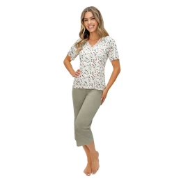 Piżama damska Melisa 3/4 kr/r to połączenie subtelnej elegancji, kobiecego stylu i wyjątkowego komfortu. Wykonana z wysokiej jakości wiskozy z dodatkiem elastanu, zapewnia przyjemne uczucie miękkości oraz doskonałe dopasowanie do sylwetki. To idealna propozycja dla kobiet ceniących wygodę i estetykę w domowym wydaniu. Koszulka z krótkim rękawem ozdobiona delikatnym, kwiatowym printem prezentuje się świeżo i lekko. Dekolt w kształcie litery V został wykończony subtelną ażurową koronką, która dodaje całości romantycznego i eleganckiego charakteru. Do kompletu dołączone są jednolite spodnie o długości 3/4, które doskonale równoważą wzorzystą górę. Elastyczny materiał gwarantuje swobodę ruchów oraz komfort podczas snu i codziennego relaksu. Model dostępny w szerokiej rozmiarówce od S do 2XL, dzięki czemu każda kobieta może znaleźć idealne dopasowanie. Produkt pakowany w foliowy worek.