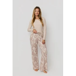 Odkryj komfort, który towarzyszy Ci przez całą noc — damska piżama z miękkiej, wysokogatunkowej dzianiny to idealny wybór dla kobiet ceniących wygodę i subtelną elegancję. Górę kompletu stanowi gładka koszulka z naturalnej bawełny, z długim rękawem i klasycznym, okrągłym dekoltem, gwarantująca pełną swobodę ruchów. Dół piżamy to długie, wzorzyste spodnie o modnym charakterze, wykonane z przyjemnego w dotyku materiału o wyraźnej prążkowanej strukturze. Dzięki połączeniu wiskozy, poliestru i elastanu spodnie są lekkie, elastyczne i doskonale układają się na sylwetce. Zestaw zapakowany jest w praktyczny foliowy worek — idealny na prezent lub podróż.