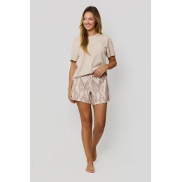 Wygodna i kobieca damska piżama z wysokiej jakości dzianiny, idealna na ciepłe noce i domowy relaks. Górę kompletu stanowi gładka koszulka z naturalnej bawełny, wyposażona w krótki rękaw oraz klasyczny okrągły dekolt, co zapewnia pełen komfort noszenia i swobodę ruchów. Dół zestawu to krótkie, wzorzyste spodenki wykonane z lekkiego, miękkiego materiału o charakterystycznej prążkowanej strukturze. Dzięki połączeniu wiskozy z poliestrem i elastanem spodenki są przyjemne w dotyku, elastyczne i świetnie układają się na sylwetce. Piżama pakowana jest w praktyczny foliowy worek — idealny na prezent lub do zabrania w podróż.