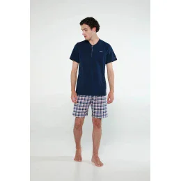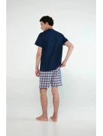 Pánské pyžamo s krátkým rukávem, zapínáním na knoflíky a krátkými kalhotami. Svěží letní barvy a tenká bavlna v károvaném provedení s oranžovými detaily.