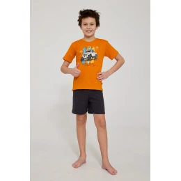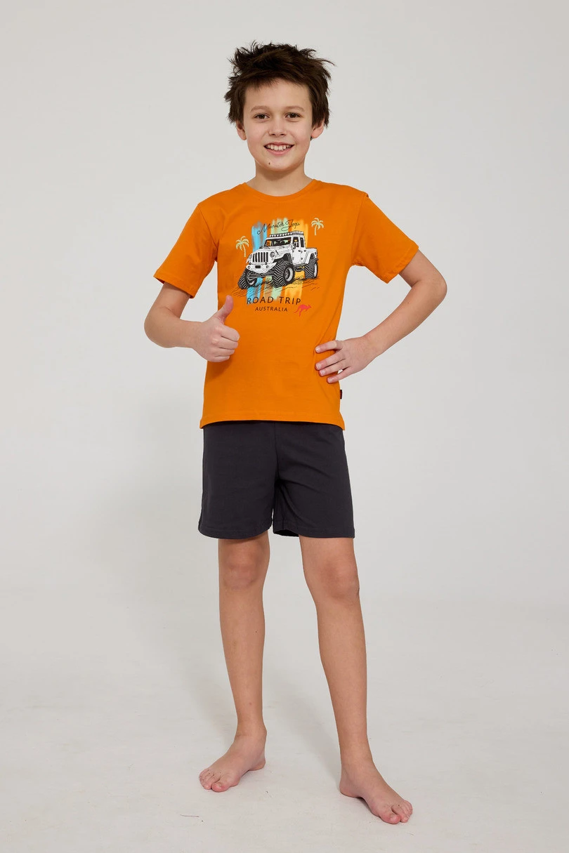 Chlapecké pyžamo YOUNG KR 476/124 ROAD TRIP 2 je pohodlná a stylová noční souprava, vytvořená s ohledem na každodenní pohodlí dítěte. Je vyrobena ze 100% kvalitní bavlny, je měkká, prodyšná a šetrná k pokožce. Tričko s krátkým rukávem bylo na úrovni hrudníku ozdobeno atraktivním potiskem, který pyžamu dodává moderní, mladistvý charakter. Soupravu doplňují krátké, jednotné šortky, které zajišťují volnost pohybu a pohodlí během spánku. Pyžamo je zabaleno v estetické krabičce, díky které je ideální jako dárek.