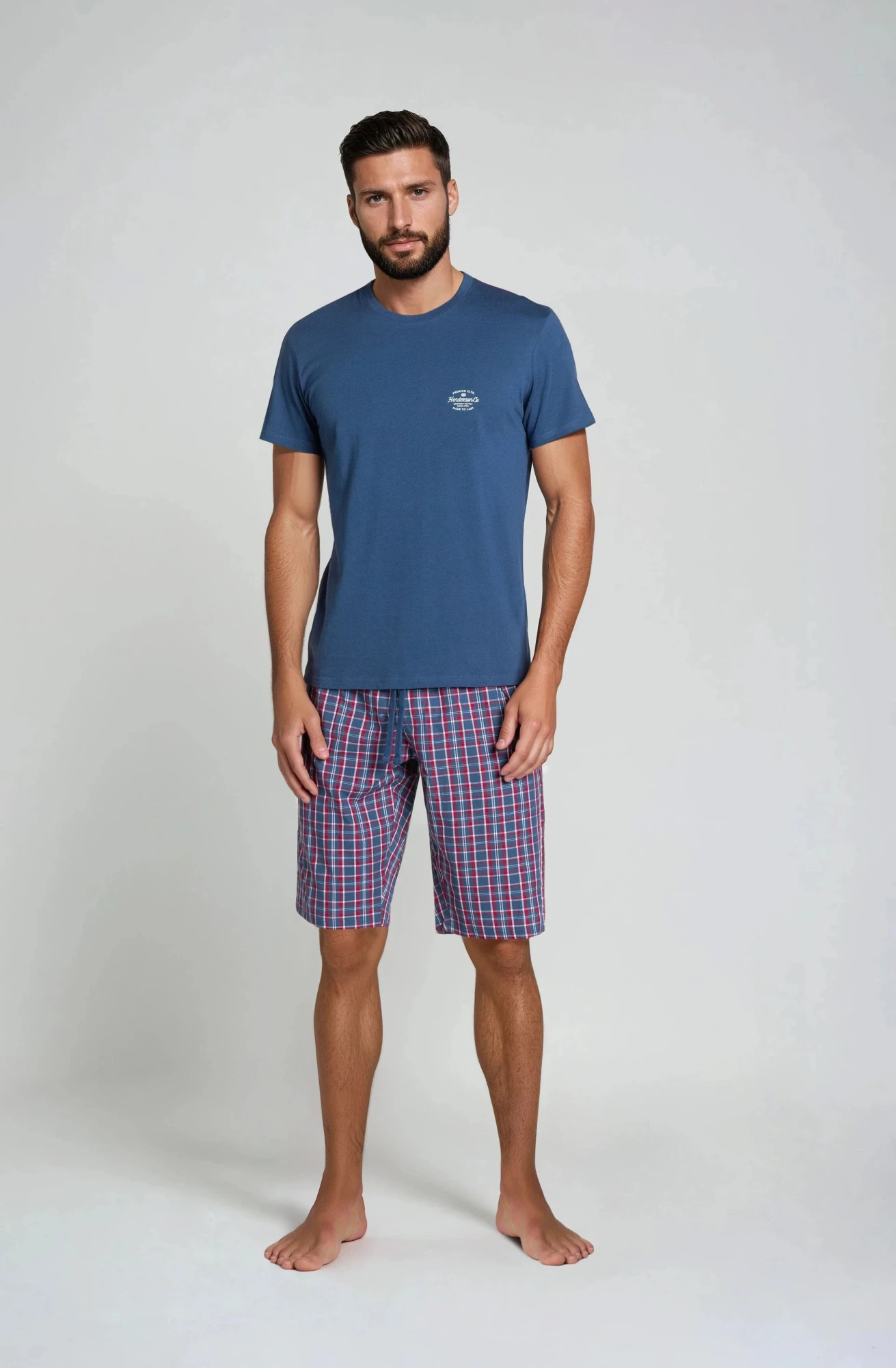 Pohodlné dvoudílné pyžamo z prémiové řady pyžam Henderson ve sportovním stylu, které obsahuje tričko a kalhoty pod kolena v lehkém příjemném kostkovaném vzoru. Barevné provedení vychází z modrého základu s vložkami červené barvy. Nadčasová a pohodlná nejnovější kolekce.
