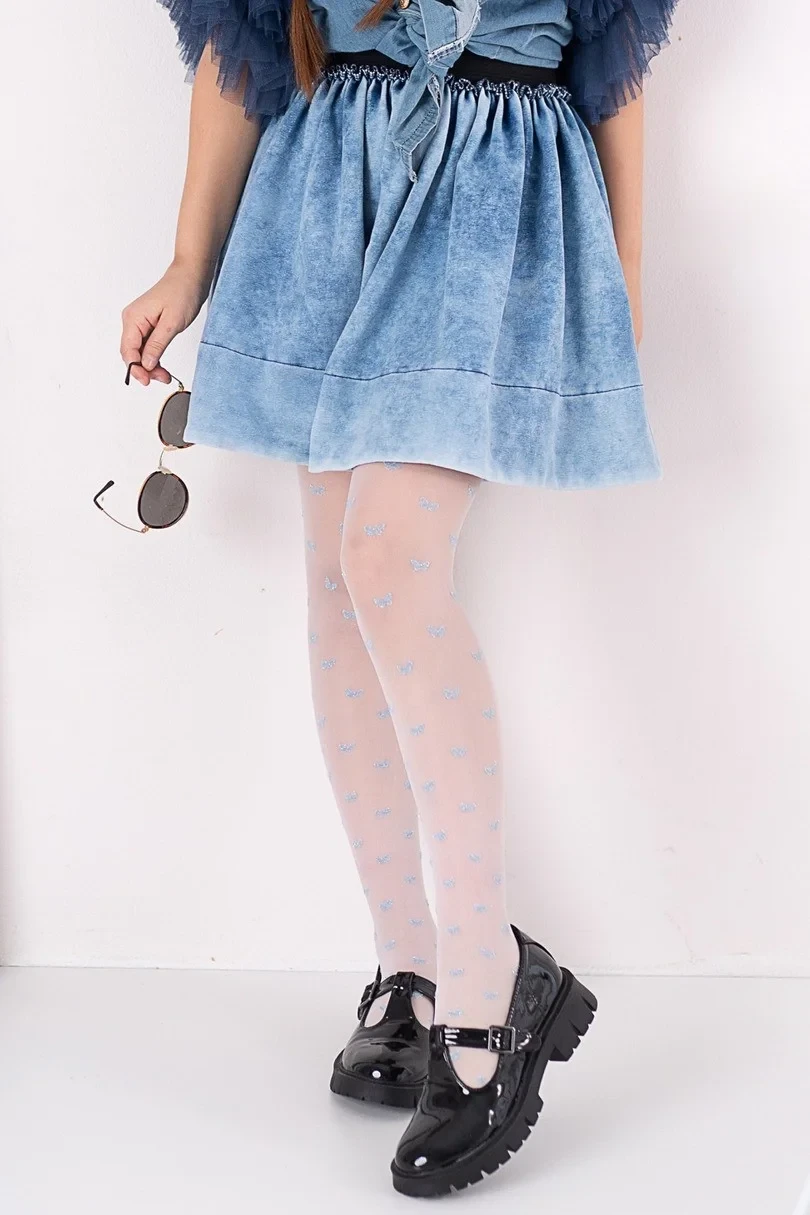 Dívčí vzorované punčochové kalhoty z dvojitě kroucené příze s přídavkem metalizované příze. Všitý klín. Vzor jemných motýlků rovnoměrně pokrývá celé punčocháče.