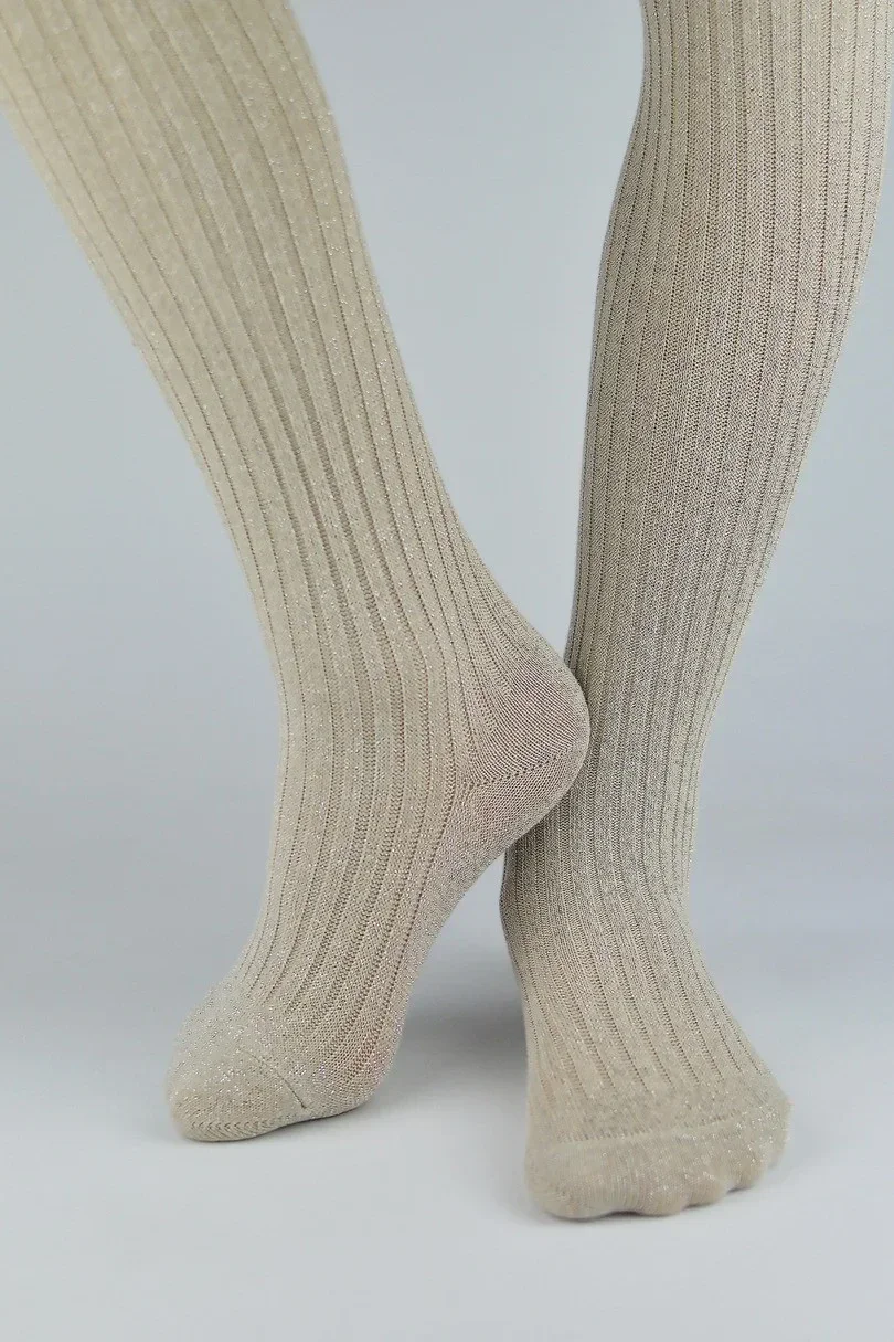 Dívčí bavlněné punčochové kalhoty s lesklou nití, žebrované. Materiálové složení: 61 % bavlna, 25 % polyamid, 11 % metalizovaná příze, 3 % elastan.