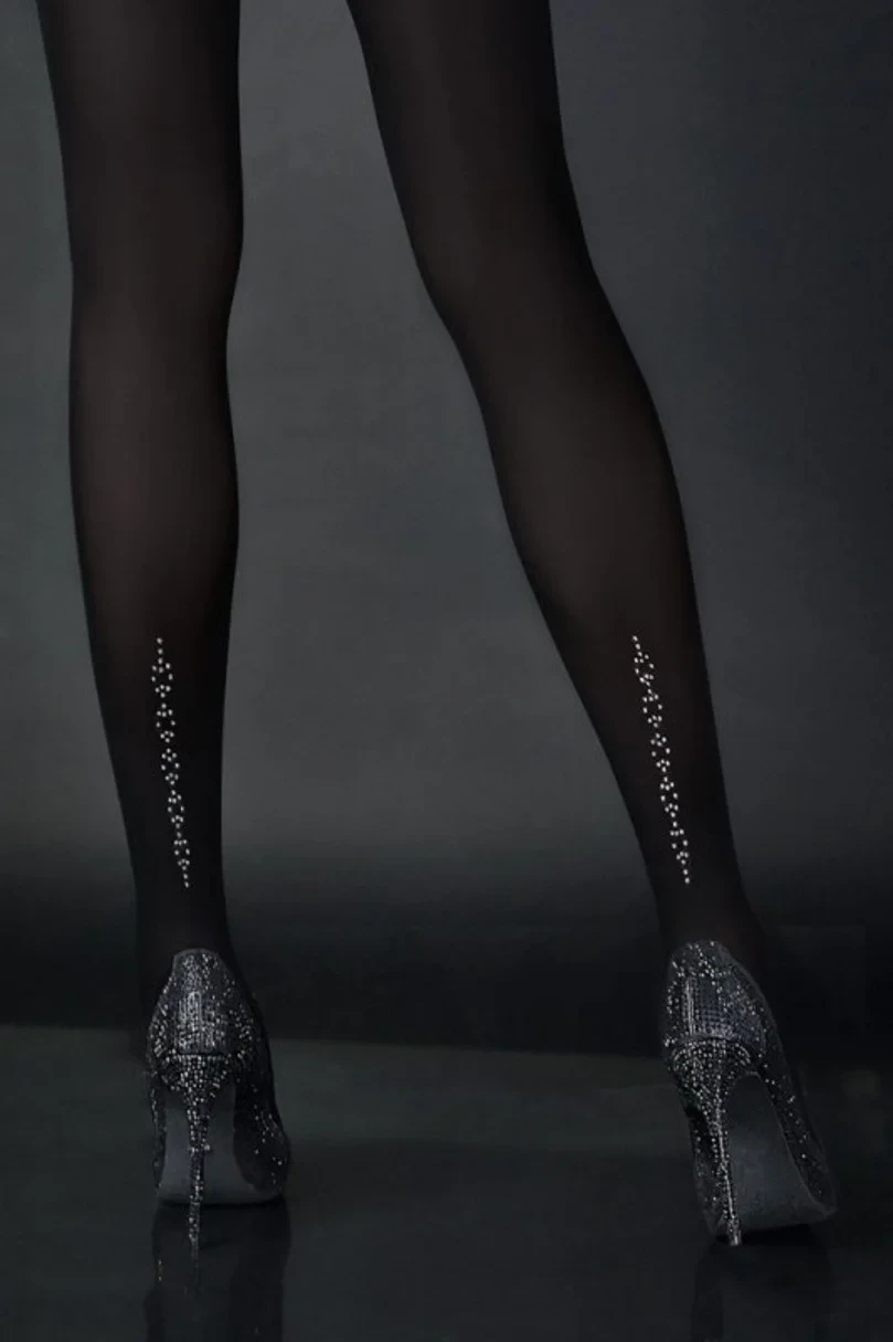 Dámské punčochové kalhoty, měkké, neprůhledné mikrovlákno 40 den, vzadu zdobené třpytivým vzorem z kamínků, elastický pas bez tlaku, velký, pohodlný klín