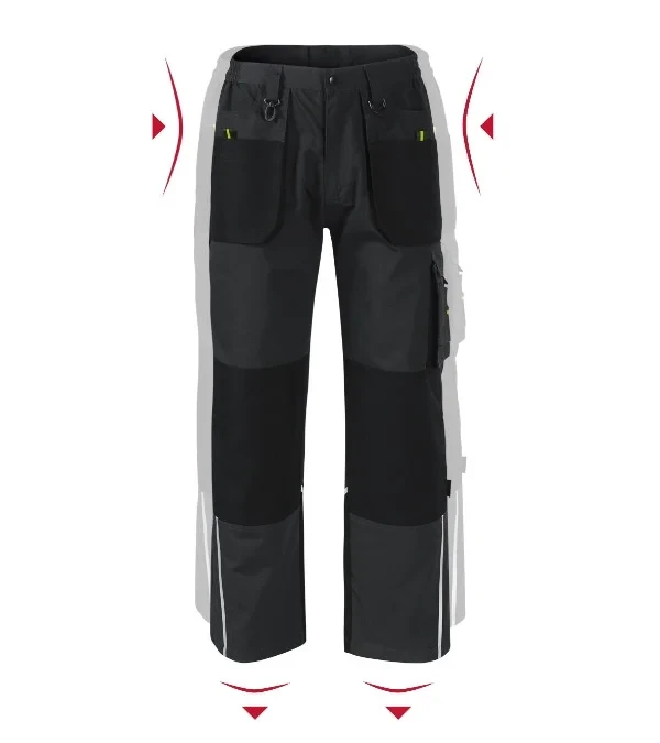 pruženka v boční části pasového límce 10 multifunkčních kapes zdvojený materiál v oblasti kolen plastové "D" poutko a karabina na klíče a ID karty poutko na kladivo dvojité prošití pro vyšší odolnost vysoce odolný materiál v barvě 01 retroreflexní prvky