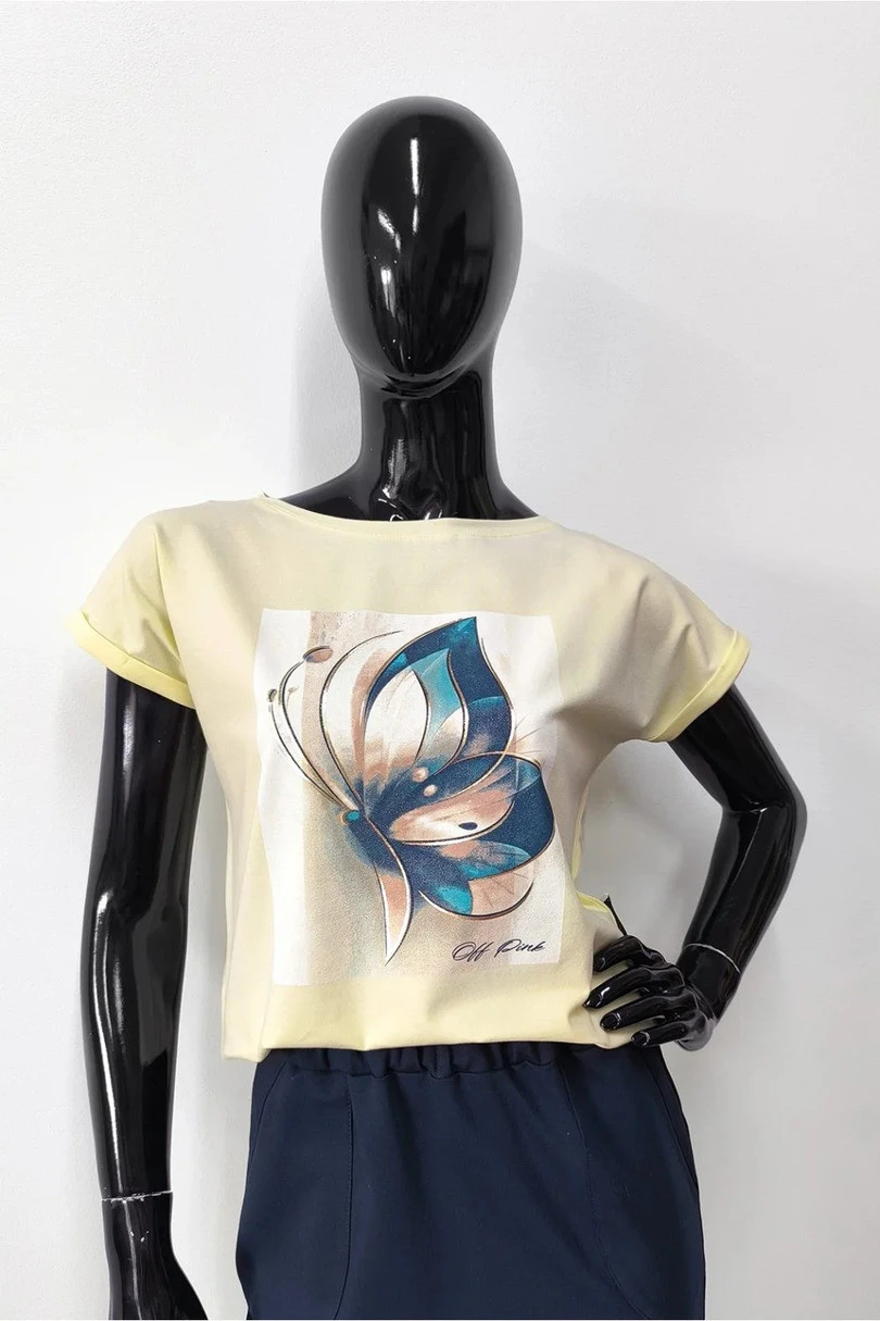 Dámská halenka s krátkým rukávem na zádech je kombinací pohodlí a ženského charakteru. Rukávy zakončené efektním ohrnutím dodávají lehkost, zatímco mírně zaoblená, prodloužená záda skvěle vyniknou na siluetě. Barevný potisk s třpytivými prvky mu dodává jedinečný šarm a přitahuje pozornost. Tričko je vyrobeno z kvalitní bavlny s přídavkem elastanu a je navrženo a vyrobeno v Polsku, což zaručuje vysokou kvalitu a pozornost věnovanou každému detailu.