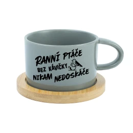 RANNÍ PTÁČE BEZ KÁVIČKY NIKAM NEDOSKÁČE - šedý hrníček makronka 200 ml
