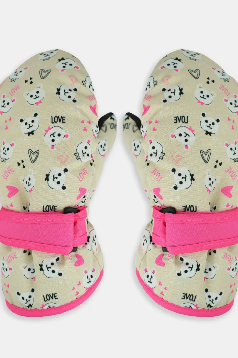 Zateplené dívčí rukavice s potiskem a jedním prstem z ortalu. Rukavice zakončené manžetou s páskem pro nastavení šířky - dobře drží na rukojetích, chrání před sněhem.