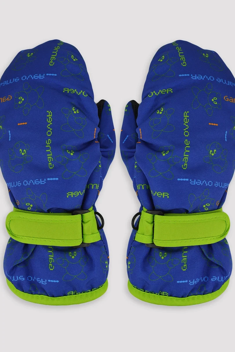 Zateplené chlapecké rukavice s potiskem a jedním prstem z ortalu. Zakončené manžetou s páskem pro nastavení šířky - dobře sedí na rukou, chrání před sněhem.