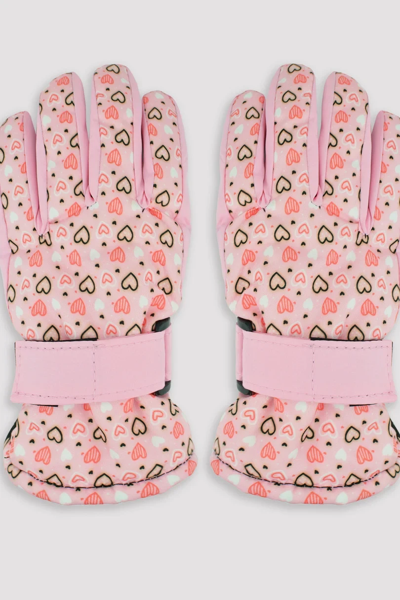 Potisknuté, zateplené, pětiprsté orthalionové rukavice pro dívky. Rukavice zakončené manžetou s páskem pro nastavení šířky - dobře sedí na rukou, chrání před sněhem.