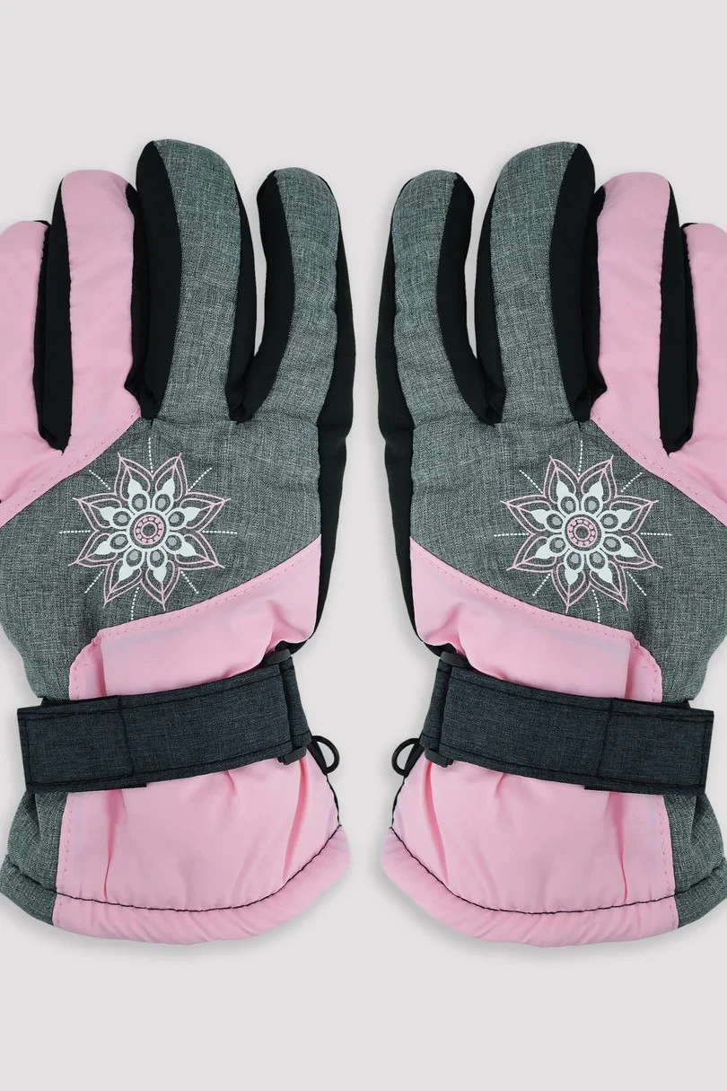 Dívčí zateplené pětiprsté rukavice s potiskem a ortaly. Rukavice zakončené manžetou s páskem pro nastavení šířky - dobře drží na rukou, chrání před sněhem.